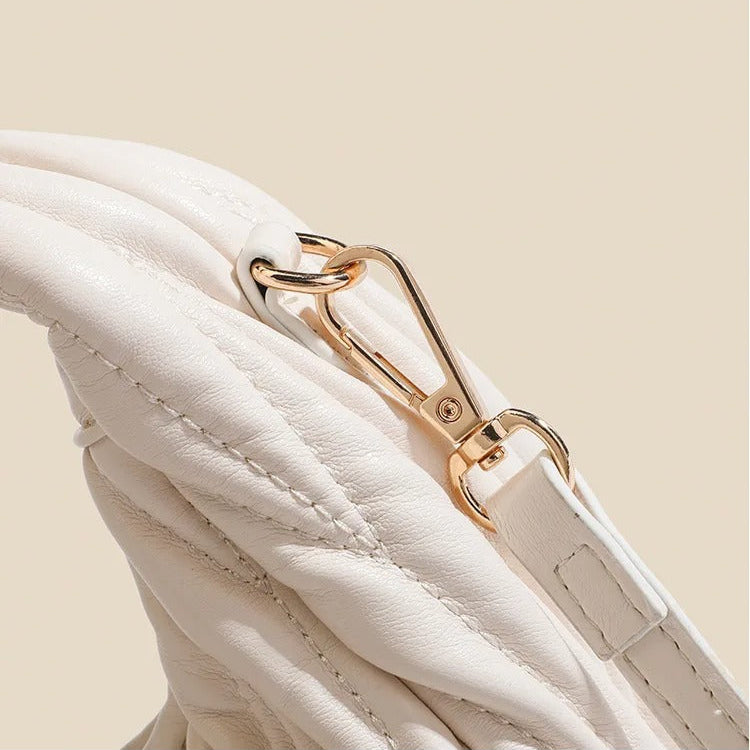Sculpted with a quilted finish, this compact bag balances playful curves with a structured silhouette. A padded handle, detachable strap, and gleaming hardware complete its versatile, modern design.