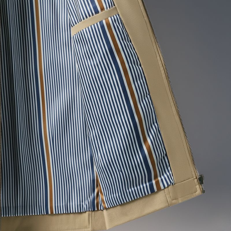 Tailored seams and clean hardware create a sharp yet effortless look in this modern utility jacket, featuring a crisp outer shell and a smooth, striped lining that speaks to understated craftsmanship.