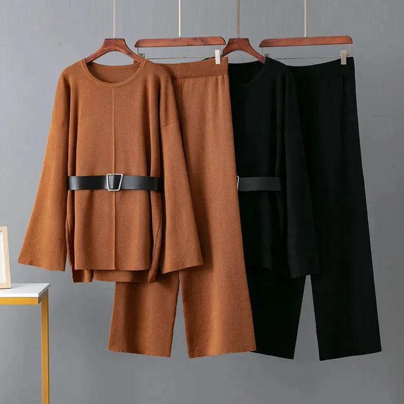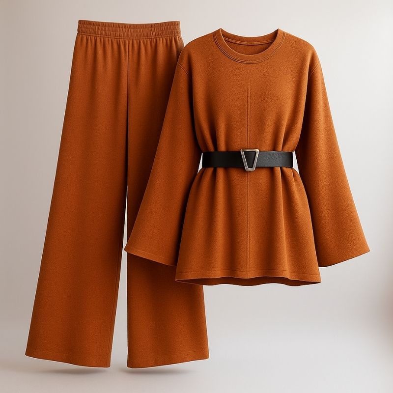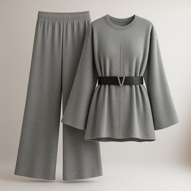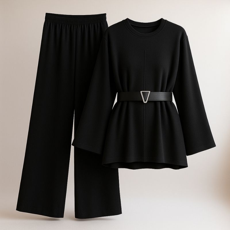 Architectural wide-leg trousers harmonize with an oversized pullover and signature belt to redefine luxury loungewear. The tonal knit fabrication creates fluid movement while oversized proportions and minimalist detailing deliver understated power dressing for the modern nomad.
